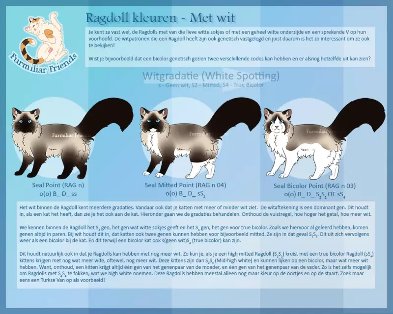 De Ragdoll komt voor in drie hoofdvariëteiten, namelijk Colourpoint, Mitted en Bi-colour.